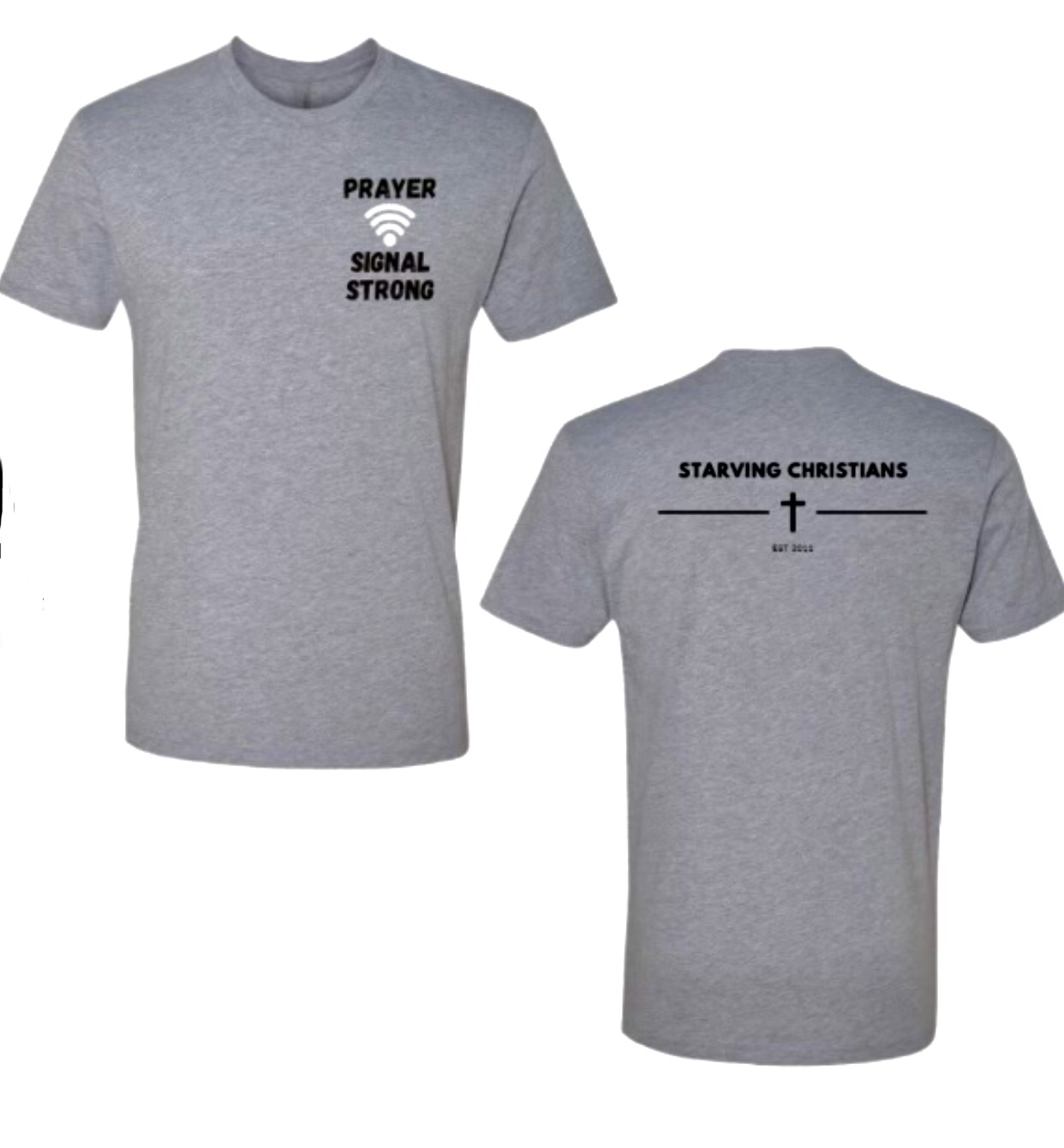 We are excited about our special limited edition Unisex Prayer Signal T-shirts for 2021! We are hoping these shirts will not only show how strong your prayer line to God is (lol) but also spread the word on how we are all Starving to know more about God! Whether through reading His word, meditation or prayer—We are all Starving Christians!!